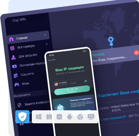 Скачайте iTop VPN для ПК, Android, iPhone, Mac или Linux — используйте до 8 устройств одновременно.