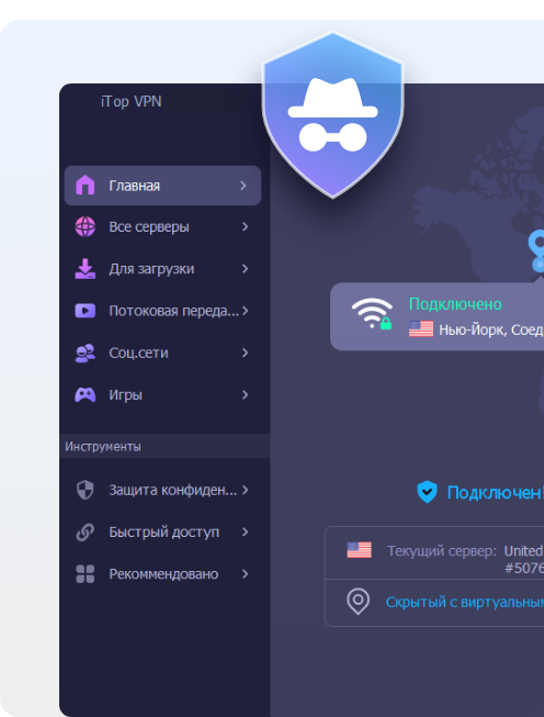 Интернет полон подозрительных сайтов и трекеров, которые нарушают вашу приватность. С iTop VPN ваше соединение и конфиденциальность находятся под защитой — вы можете пользоваться сетью без страха за вторжение в личную жизнь.